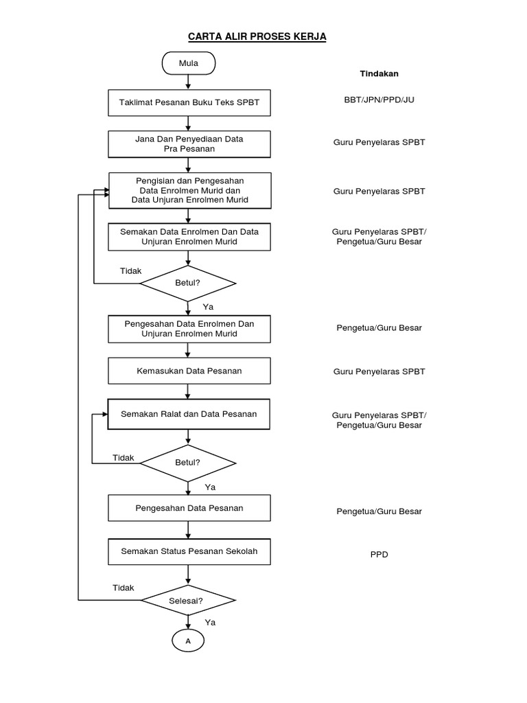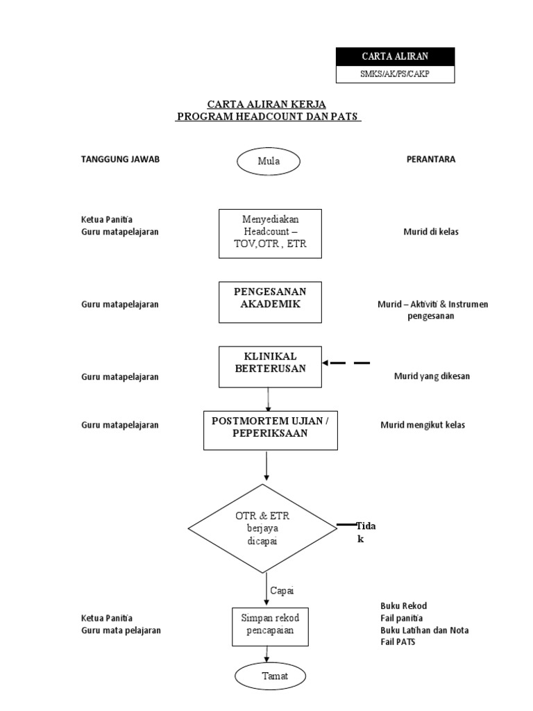 Walau banyak kali aktiviti satu unit berpotongan dengan aktiviti-aktiviti unit lain. Carta alir digunakan merentasi pelbagai industri. Ya Lapor kepada Pengetua Dapatkan Kakitangan sumber Semak rekod Beri ceramah pengurusan dan khidmat PSS.
